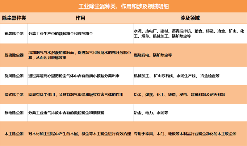 布袋除塵器、脫硫除塵器、旋風(fēng)除塵器、濕式除塵器、靜電除塵器、木工除塵器等多種款式的除塵器設(shè)備,使用方法也比較多,可單獨(dú)使用亦可配套使用,可針對(duì)不同產(chǎn)業(yè)和不同煙塵特點(diǎn)進(jìn)行選擇,_了工業(yè)除塵效果,具體可以參照下表: