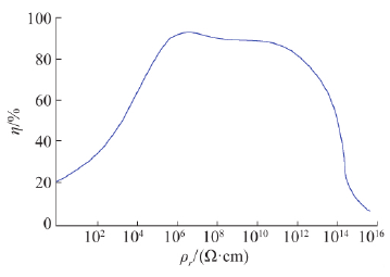 例如在250℃時,粉塵的比電阻為1011Ω·cm;當煙氣溫度上升至380℃時,粉塵的比電阻降低至1.06×109Ω·cm,僅為250℃狀態(tài)下的1.06%。靜電電除塵器的除塵效率與粉塵的比電阻直接相關,電除塵要求粉塵比電阻為104~1011Ω·cm。尤其當粉塵的比電阻分布在106~1012Ω·cm之間時,比電阻越小,除塵效率會有所升高,見圖5。