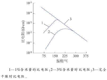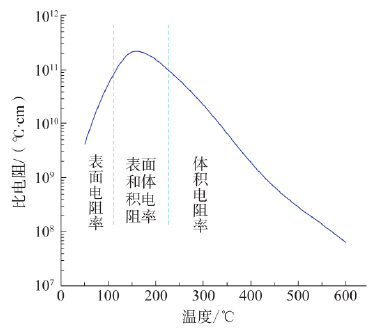 粉塵比電阻是兩種獨立的導電機理的綜合,即體積比電阻和表面比電阻。當粉塵溫度>225℃時,體積傳導機制起主要作用,溫度上升、粉塵比電阻減小;當溫度<150℃時,表面?zhèn)鲗C制主要作用,溫度上升、粉塵比電阻增大;當溫度為150~225℃時,粉塵比電阻會出現(xiàn)峰值,達到1012Ω·cm等級,見圖4。