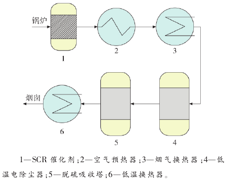 當前燃煤鍋爐環(huán)保系統(tǒng)的主要設備流程布置方式為:脫硝裝置+空氣預熱器+煙氣換熱器+除塵器(+低溫加熱器)+脫硫裝置,見圖1。
